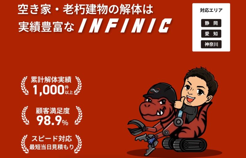 株式会社インフィニックは、大規模な建造物からアパートやマンション・一般住宅などの解体工事、撤去・処分までワンストップで行っています。